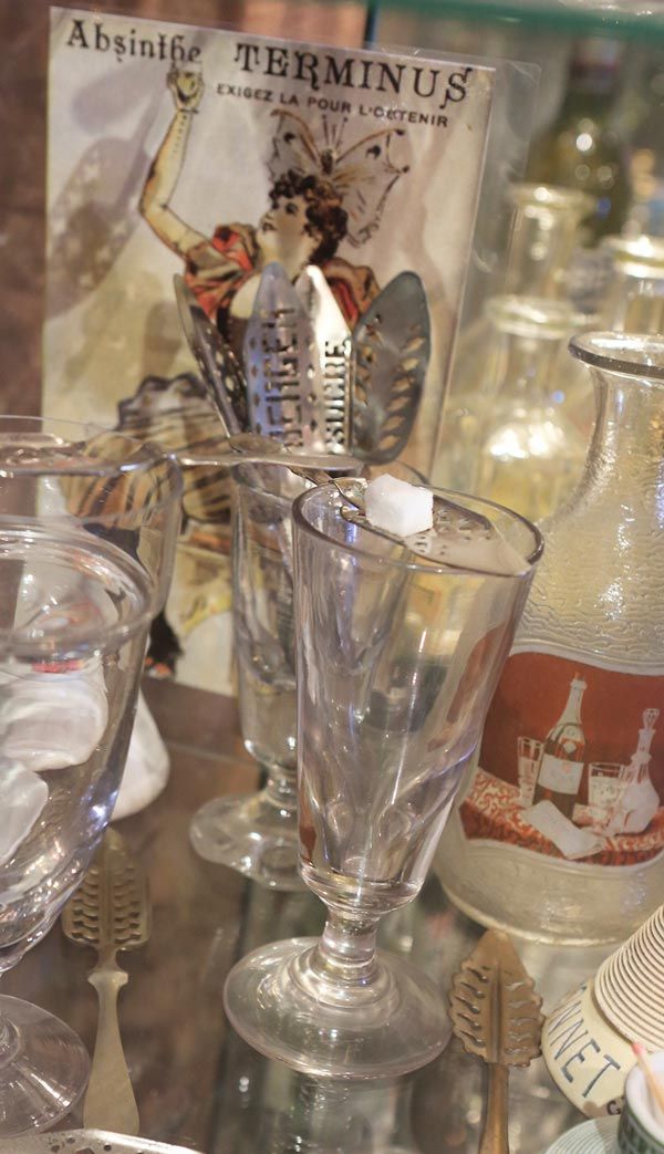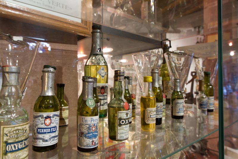 Absinth: a mythical beverage, banned for 80 years. Collection of objects and original bottles dating back before the ban patiently assembled: spoons for the absinth, old bottles, carafes, absinth fountains, glasses…