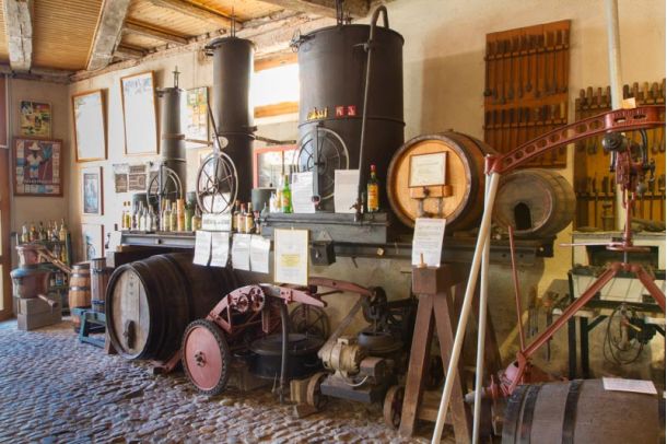 Ancient wine cellar equipment: zester, moulds for bottles, bottling devices, demijohns, filters…